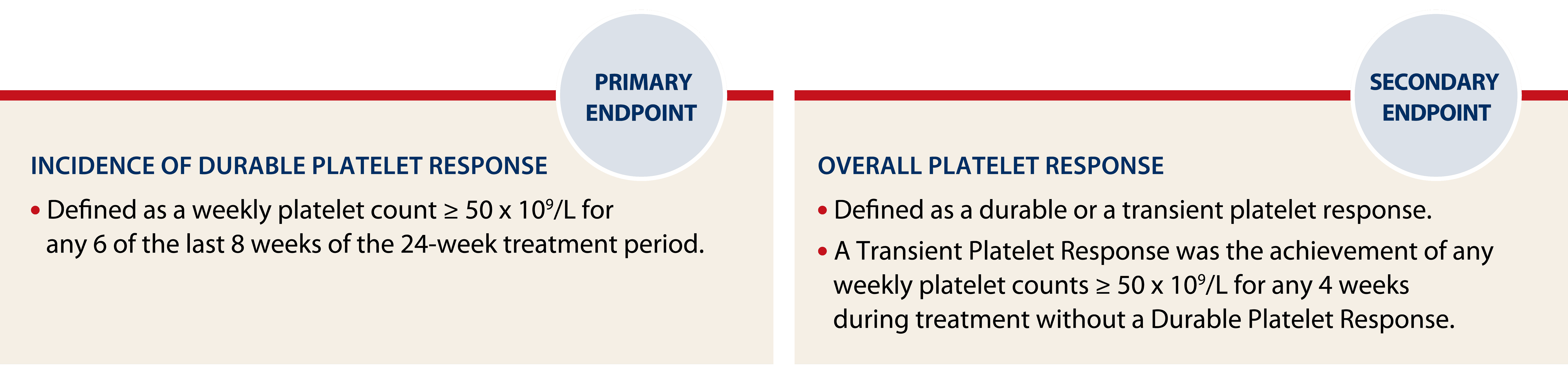 - Patients were refractory or relapsed after at least one prior ITP therapy with a platelet count ≤ 30 × 109/L.