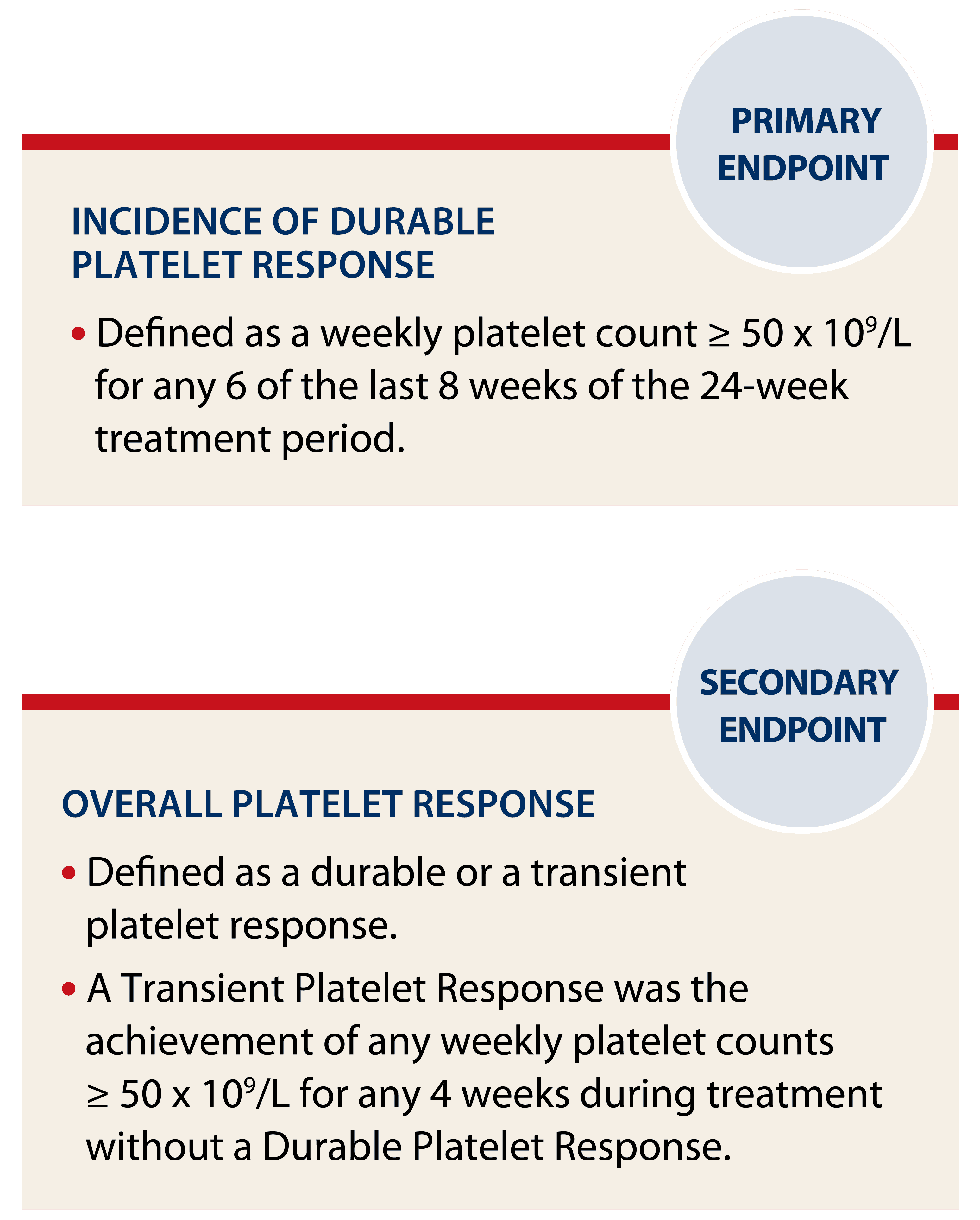 - Over a 24-week treatment period, dose was titrated up to a maximum of 10 mcg/kg weekly of either Nplate® or placebo in an effort to maintain a target platelet count of ≥ 50-200 × 109/L.